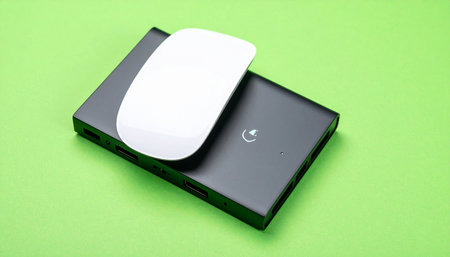 A sleek white wireless mouse rests on a black portable hard drive, creating a clean, modern composition against a vibrant green background.