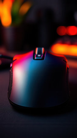 A sleek gaming mouse with vibrant lighting showcased in a moody home office setup.