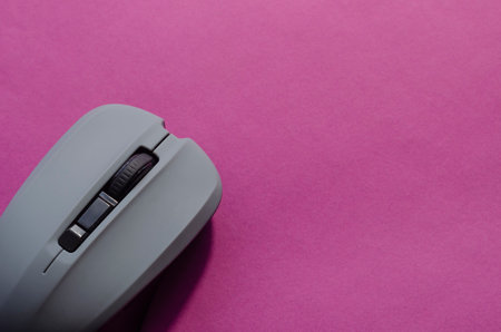 Minimalist background with computer device on pink background. Gray wireless computer mouse. Copy space, selective focus.