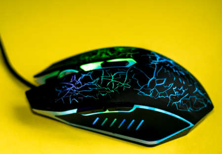 Black computer mouse with backlight on a yellow background. Technological equipment.