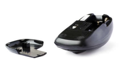 close-up of black wireless mouse isolated on white out of focus background