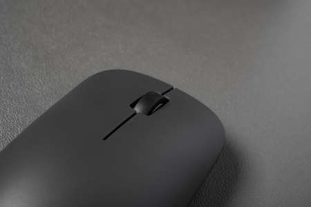 Black computer mouse on a light background. close-up photo.
