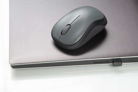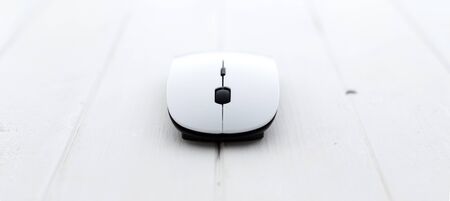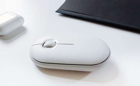 Computer wireless mouse next to a laptop on a white table close-up. electronic personal industry