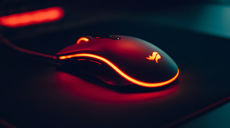 A modern ergonomic gaming mouse casts a warm orange glow across a desk, ready for a late-night session of intense focus and digital adventure.
