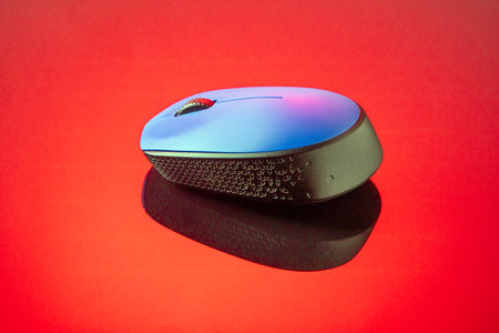 This striking image showcases a blue computer mouse set against a glossy red background, with a perfect reflection enhancing its appeal.