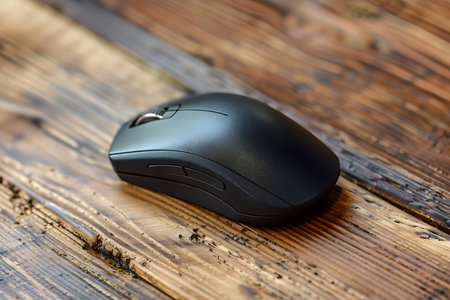 A cordless black computer mouse sits on a weathered and textured wooden surface. Focus highlights the mouse's ergonomic design, contrasting with the wood grain.