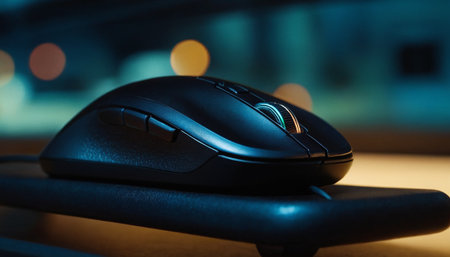 Computer mouse on a table with city lights in the background at night