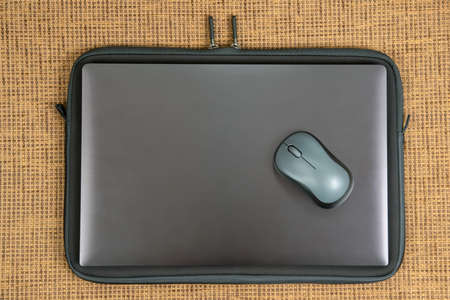 laptop case. zipper close-up. device protection. laptop and computer mouse