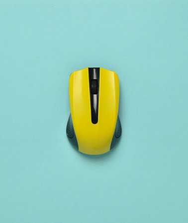 Wireless mouse isolated on a blue pastel background. Top view, minimalist trend
