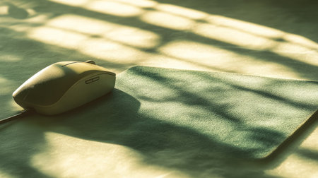 A serene close-up of a computer mouse on a green felt mouse pad, capturing gentle shadows and daylight for a calming workspace ambiance perfect for productivity.
