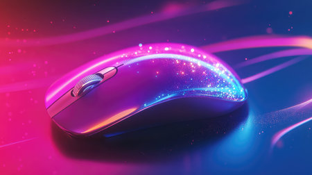 Floating wireless black pc mouse in blue-pink gradient neon light