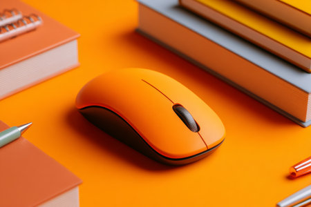 A bright orange computer mouse sits on an orange desk. Nearby, there are stacks of books and some stationery items. This setup is suitable for studying or working.