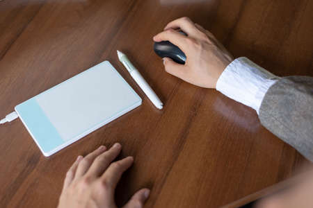 Closeup view of a designer or illustrator using a digital stylus pen working on a tablet. Wide view image.