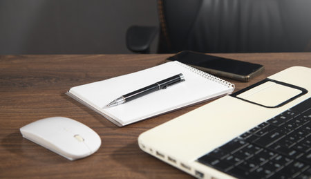 office workplace. Notepad, smartphone, laptop computer, mouse.