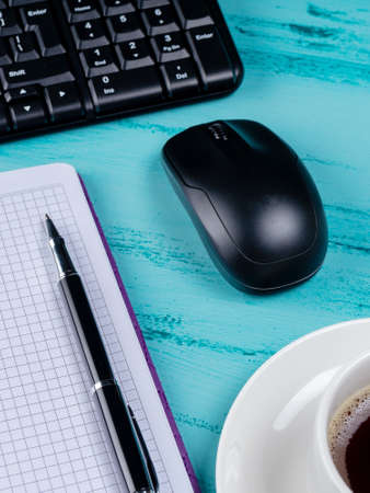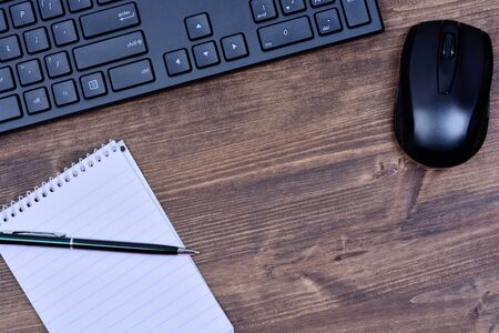 Office table with notepad, computer keyboard, mouse and pen. View from above.
