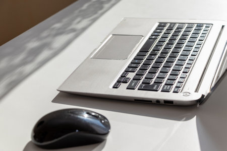 Computer wireless mouse, pen and notepad next to a laptop on a white table close-up. Items for office work