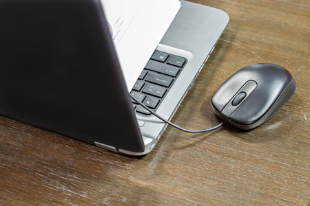 white mouse and a laptop putting on the brown wood table. Social Distancing and work from home Concept.