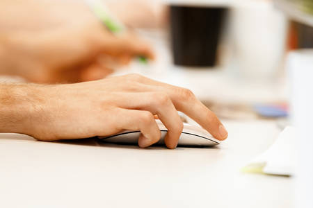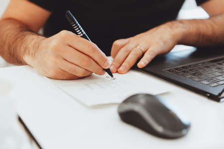 Closeup Photo of a Man Drawing Plan on His Workplace. Body Part. Work with Computer in the Office. Coffee Cup. Business People Concept.