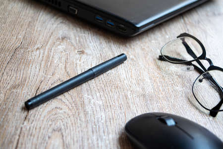 Artistic color photo of a laptop pc computer. biro pen and wifi mouse on office work desk table.