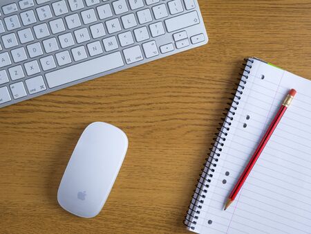UK, October 2019: Apple mac wireless mouse and keyboard on wooden desk with notepad and pencil