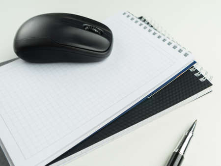 PC mouse and notebook on table