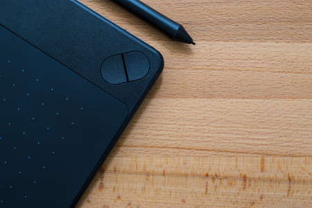 Digital graphic tablet and pen on wooden background