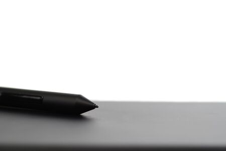 Pen with a graphic tablet in the hands of the designer, close-up. Gadget for art and work. Macro