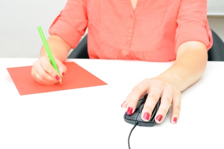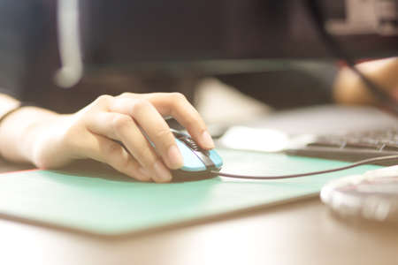 closeup of a female hand clicking computer mouse, technology and teleworking concept, selective focus