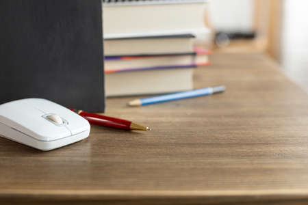 White wooden table with pen, mouse, notebook, . Workspace with copy space.