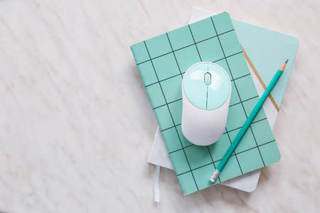 Highlighter pen and computer mouse on a workbook with copy space