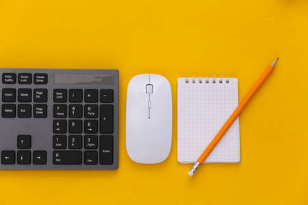 PC keyboard, mouse, notebook on yellow background. top view