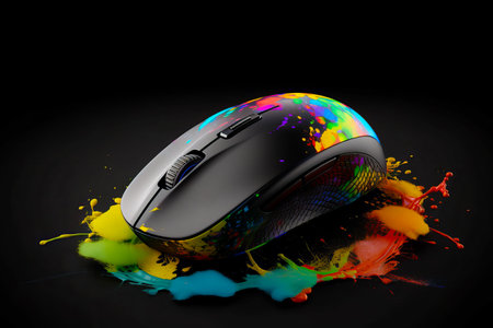Computer mouse sitting on top of table covered in colorful paint and splatters. Generative AI.