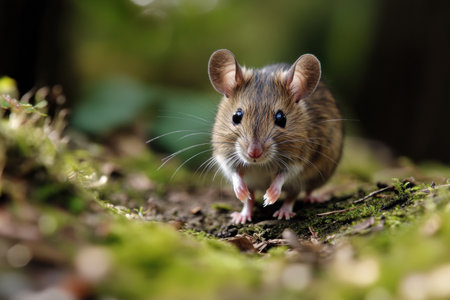 A curious brown mouse with small ears is moving on the forest floor, surrounded by vibrant greenery and soft moss in spring.