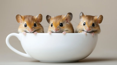 A charming image of three cute mice peeking out of a coffee cup, conveying curiosity and fun. Perfect for themes of wildlife, innocence, and joy.