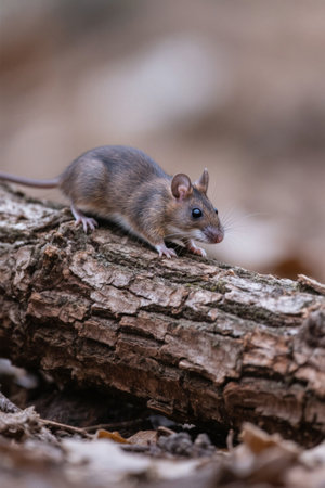 A gray field mouse is seen in its natural environment, foraging on the forest floor. This image captures the small mammal in its wild habitat, highlighting the beauty and intricacy of rural wildlife and nature.