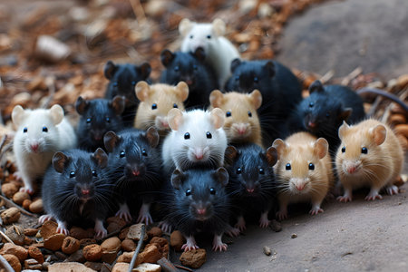 A diverse group of pet mice, featuring various colors including black, white, and brown, gathered on natural terrain with rocks and pebbles. the mice, with their curious expressions and delicate whiskers, present a vibrant scene of small animal companionship and pet diversity.