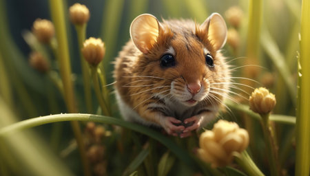 a tiny mouse perched on a stem, basking in the sun's rays, captured in a stunning national geographic photo. this enchanting image showcases fantasy creatures in a white and orange color palette. with its realistic animal portrait and jagged edges, it transports viewers into a whimsical world. ai generated