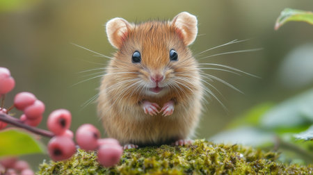 A small, adorable rodent with large eyes sits on a moss-covered stone. Pink berries add a pop of color around the animal, while the vibrant greenery indicates a thriving garden environment during the day.