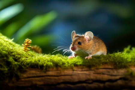 a mouse stands upright amidst lush plants on a log, illuminated skillfully with golden light. this photo showcases photo-realistic techniques, combining elements of animals and people in an aurorapunk style. the charming character of the mouse is enhanced by the use of rtx technology, creating a visually stunning and captivating image. ai generated