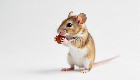 A cute mouse nibbling on a small piece of food, with ample copy space in the background for text or branding.