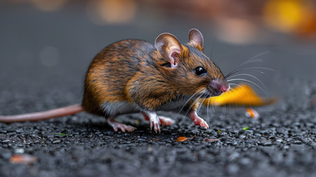 Brown mouse with tail on asphalt path, yellow leaf in foreground