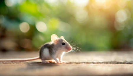 Tiny mouse on wooden floor. Small rodent. Close-up image with soft focus and bokeh background.