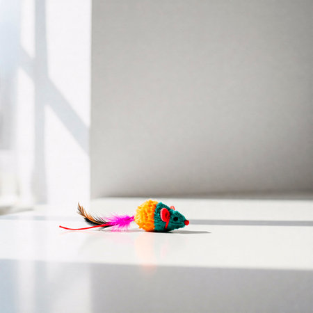 Colorful toy mouse with feather on white background. Minimal concept