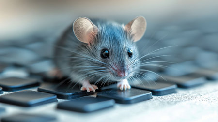 A small gray mouse curiously navigates a black keyboard, its tiny paws delicately pressing the keys. Sunlight filters in, creating a warm atmosphere, showcasing the mouse's expressive eyes and fine whiskers.