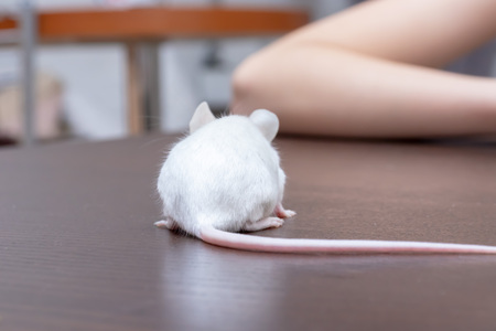 Child playing with pretty cute little white laboratory mouse.