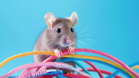 A delightful gray mouse is playfully climbing over a tangled mess of colorful cables against a vivid blue background. This charming image captures the curiosity and playfulness of the small creature, making it perfect for themes of technology, pets, and animal behavior.