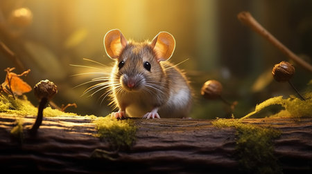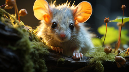 a mouse stands upright amidst lush plants on a log, illuminated skillfully with golden light. this photo showcases photo-realistic techniques, combining elements of animals and people in an aurorapunk style. the charming character of the mouse is enhanced by the use of rtx technology, creating a visually stunning and captivating image. ai generated