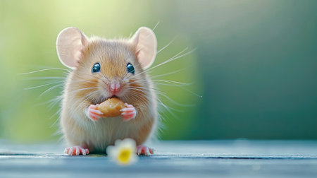 A cute mouse nibbling on a small piece of food, with ample copy space in the background for text or branding.