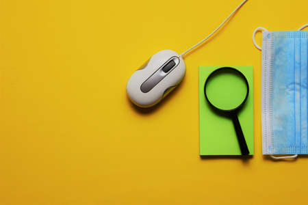 Wired pc mouse on yellow background, space for text