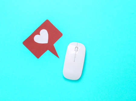 Pc mouse with like notification icon on turquoise background. social media. Rating, followers feedback. top view